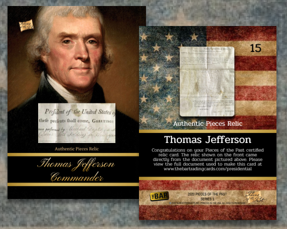 The first person to build a master set for this product and contact the company will receive the Thomas Jefferson 1/1 cut autograph seen above, while the second person to create the master set will receive 24 cases of Pieces of the Past products (two per month, past and future releases) for a year.