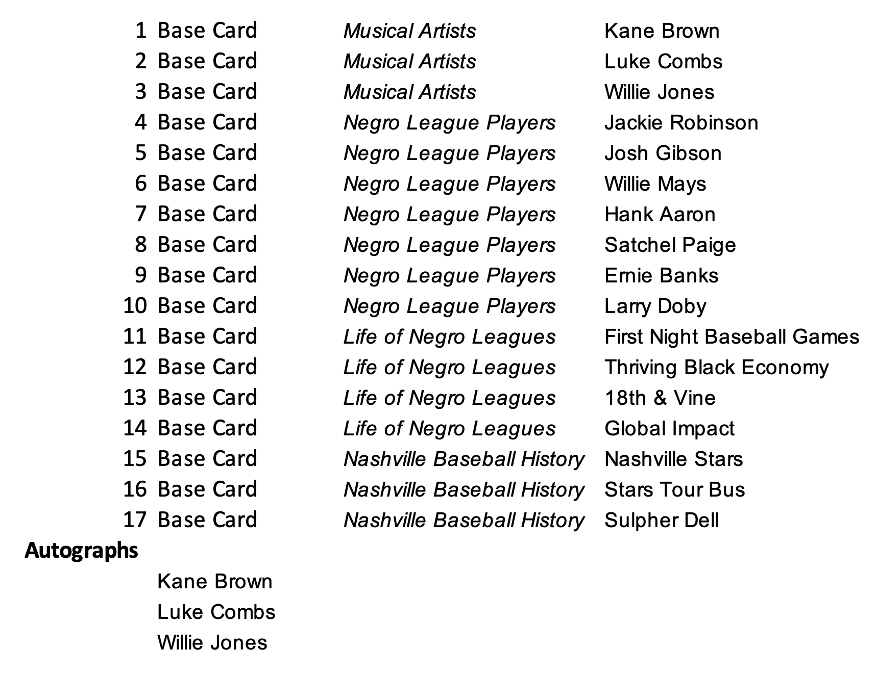 According to Topps, the "release of these baseball cards is one of Music City Baseball’s many contributions to the Negro Leagues Museum, including revenue sharing on all promotional items sold on their website." If an MLB team is award to Nashville, it would be known as the Stars, a nod to a past Negro League team in the city.