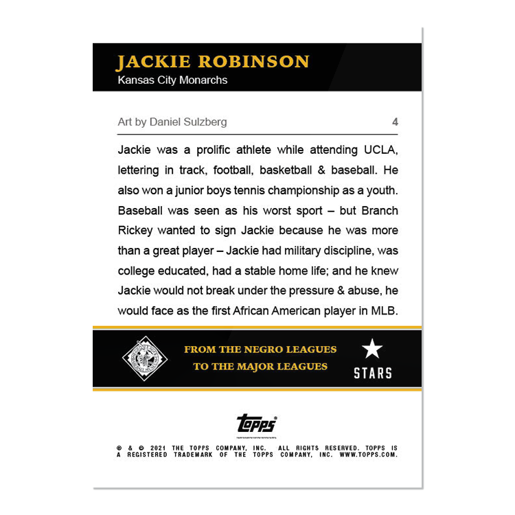 The Fluent Group teamed with illustrator Daniel Sulzberg to bring the visuals to life. You can see a sampling of the creations as well as the full checklist below. There will be two types of parallels in the mix this time -- Rainbow foil parallels (/101) for the 101st anniversary of the league this year and then a set of /35 parallels for the 35 Negro League players in the Hall of Fame. Other notable players in the set are Hall of Famers Jackie Robinson, Josh Gibson, Hank Aaron, Ernie Banks and Larry Doby.