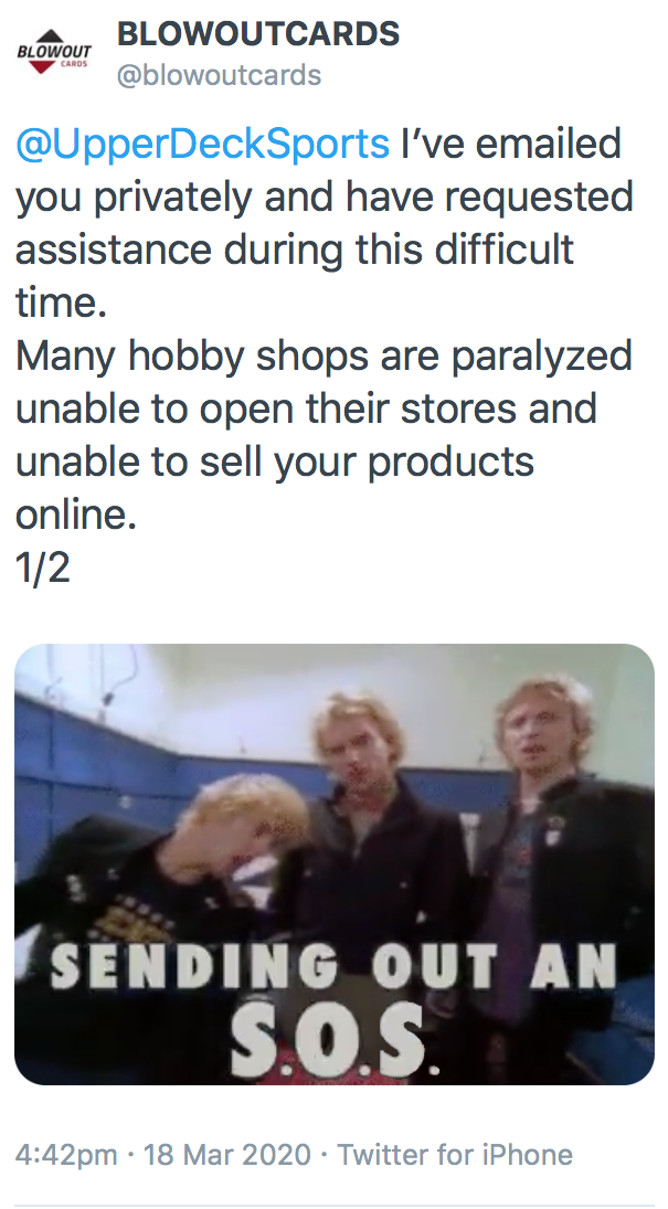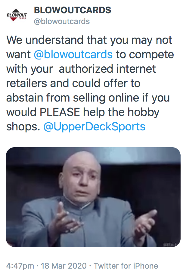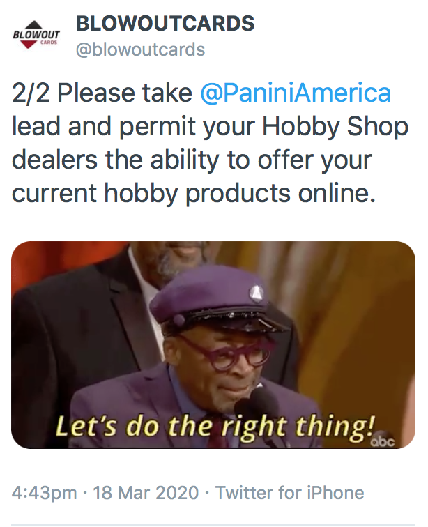 Blowout Cards followed up on the subject with public tweets (below) supporting the move that would assist already struggling shops but has not received a response.