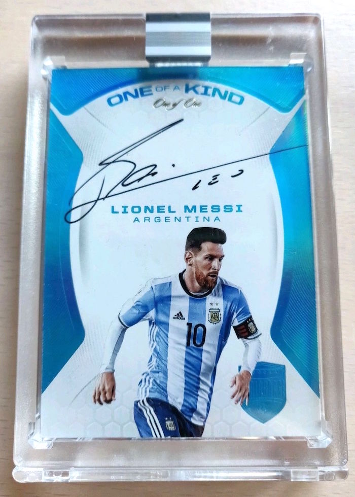 Those crafted wood boxes include at least 10 cards (nine autographs) but there also are Hot Boxes that include as many as 15 cards (one in four boxes). These scorchers have included gems like the Lionel Messi 1/1 diamond autograph you see above. Earlier this month, that card collected 38 bids on eBay and sold for $4,450.