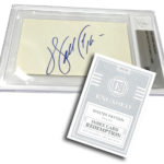 Encased boxes include one slabbed card and four other cards -- a total of two autographs and two memorabilia cards along with one base card.