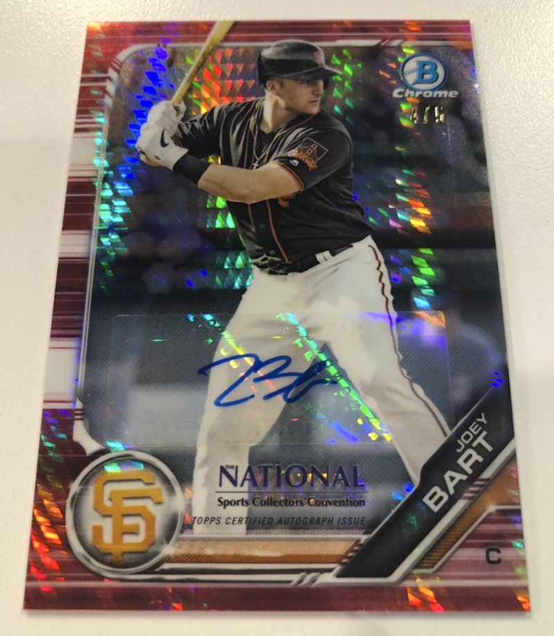 - Via @Robski3030 … The @Topps redemption packs were very good to us today. Joey Bart Red Refractor Auto /5 just hit. Maddox does it again 🔥