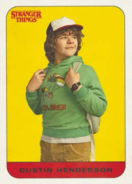 This 13-year-old was the missing mystery kid in Season 1, but we’ve seen more of him in the episodes beyond those where he "spoke" through lights and phone calls. Away from Stranger Things, Schnapp's first role was in Steven Spielberg’s Bridge of Spies where he played Tom Hanks’ son. He also voiced Charlie Brown in The Peanuts Movie. Some of his future credits include Waiting For Anya with Anjelica Houston and Intensive Care, a film with Katharine McPhee, Mira Sorvino and Lena Olin among its cast. His presence in Season 2 is truly large, so the interest in his cards should be interesting -- and we should see more of him in future sets after this first one from Topps.