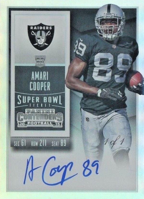 -- Amari Cooper OK, this guy didn't play on Sunday -- this is my first non-Sunday highlight of the year in this series -- but his numbers hold up as some of the best this week. This new Cowboys WR had just eight catches on Thanksgiving against Washington, but he ended up with 180 yards and two touchdowns in a 31-23 win. His first Cowboys cardboard, by my quick research, could end up arriving today (or this week depending on holiday lags) via Panini Instant. His Rookie Cards and autos (not that plentiful) can be found back in 2015 boxes when he was a fresh first-round pick out of Alabama. >> Check out his autos on eBay
