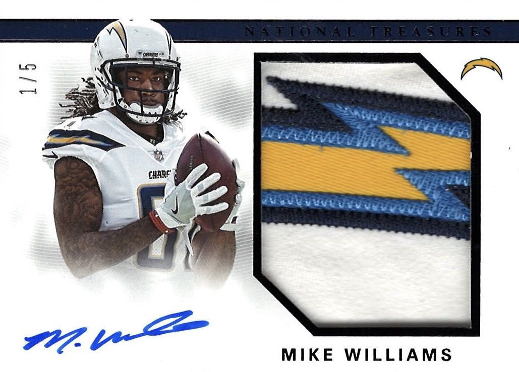 -- Mike Williams This former Clemson star hasn't put up a 100-yard game yet this season but he's got nine receiving touchdowns and 592 yards this season for the Los Angeles Chargers. Two of those TDs came this week as part of a seven-catch, 76-yard day and he added a rushing TD on his only carry as well as a two-point conversion. His stuff is likely off the radar for a first-round (seventh overall) pick so his 2017 Rookie Cards and first autos could have some potential for growth if he continues to play well.