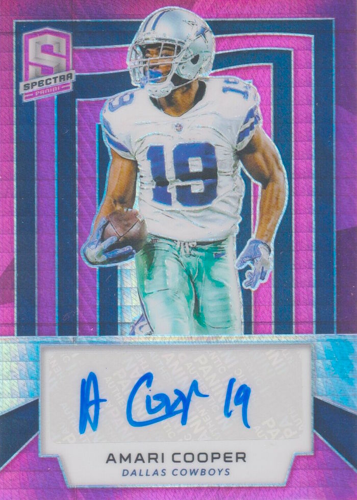 -- Amari Cooper, WR, Cowboys Who had the biggest day among receivers yesterday when it came to yards? It was Cooper, who caught 11 of 14 passes that came his way for 226 yards and a TD where he definitely had all the right moves to get the points on his 53-yard TD. (See the move here.) That yardage mark appears to be a career-high for the fourth-overall pick from back in 2015. His autos have always been a tad pricier than you might expect but days like this one probably make them worth it. If bargain-hunting, go grab some Raiders ink -- but I think his hottest autos on more standard cards (not rare stuff) might be the ones showing him with his current team.
