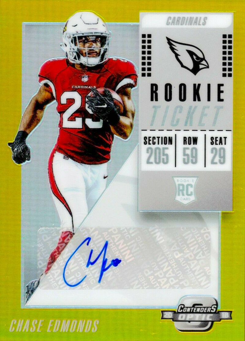 -- Chase Edmonds, RB, Cardinals Sure all eyes are on the No. 1 draft pick in Arizona, but it was this 2018 rookie who put up big numbers on Sunday. He had 27 carries for 126 yards and three TDs in a 27-21 win over the Giants, who had another notable 2018 rookie, Saquon Barkley, back in the lineup. This fourth-round pick out of Fordham had just one TD this season and only had season-highs of eight carries and 68 yards before this game so it's a definite break-out performance. He appears on roughly 300 cards from last year's releases and half of those are autos, which is generally low. Most of his autos can be found in earlier releases with Contenders and Elite Draft being releases with more ink than others.