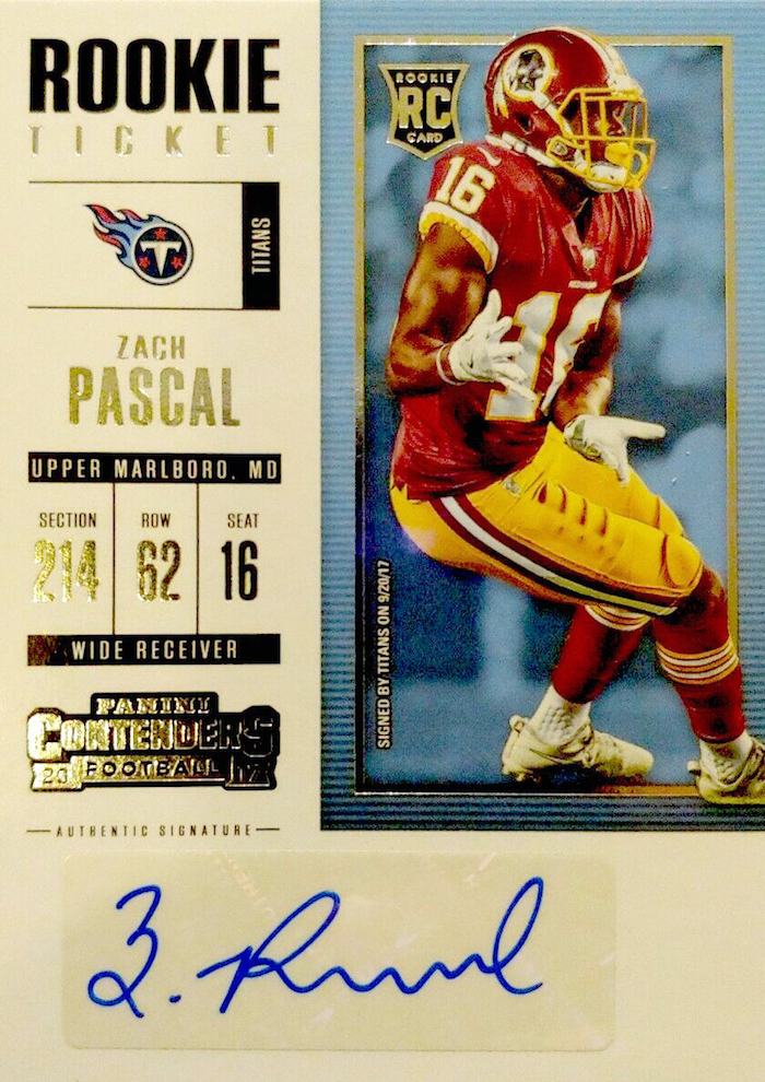 -- Zach Pascal, WR, Colts There's probably one name that comes to mind first with this team this season -- and it's the guy who's not around -- but QB Jacoby Brissett has put up numbers in the past and should be watched and it's guys like Pascal who might come out of nowhere to become of-interest on cardboard with this team. He caught six of seven passes that came his way for 106 yards and two TDs as part of a career day that ended with a 30-23 win over the Texans. As you might be able to tell from his Rookie Card above, it's not been a walk right into an NFL spot as he was un-drafted and signed by Washington, been on the practice squad of the Titans before getting time and then ended up in Indy last year. (Check out his transactions here ... it's actually way more complicated than that.) He appears on fewer than 40 football cards and, oddly, all of them are autographs -- appearances in last year's Contenders, Contenders Draft Picks and Elite Draft Picks sets ... that's it.