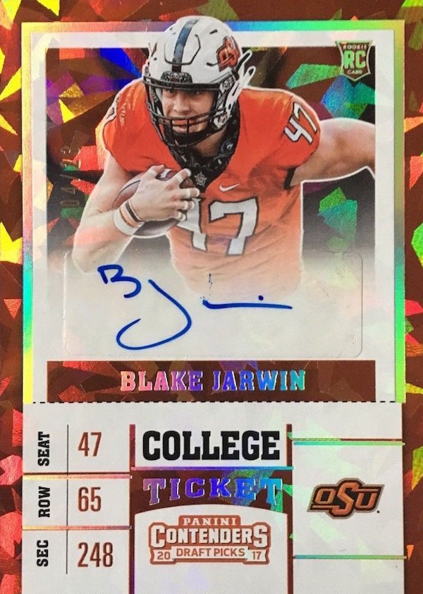 -- Blake Jarwin He was a walk-on at Oklahoma State and went undrafted this year, but this TE had a day against the Giants on Sunday with seven catches for 119 yards and three TDs. Call it a break-out kind of game. He also eclipsed his Rookie Card total in that one -- he has just two RCs in Contenders and Elite draft sets and those releases are where you will find his only certified autographs. >> Check out his autos on eBay