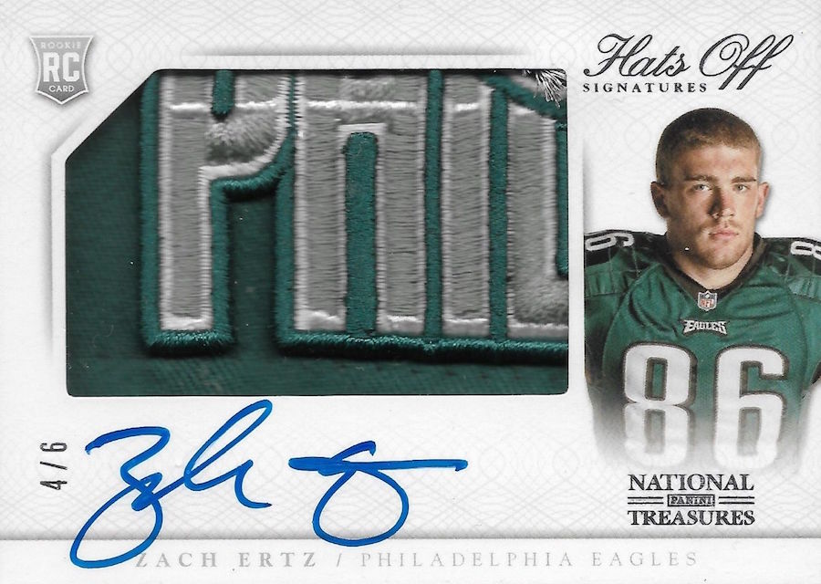 -- Zach Ertz The Eagles didn't pick up the W but it wasn't the fault of their TE who is on pace to have a record-setting season at his position. He led all NFL receivers this week with 14 catches for 145 yards and two touchdowns in a loss to the Cowboys on Sunday Night Football. He could set a career-high for yards in his next game and it won't be long for touchdowns, either, as he's on pace to have the best TE season ever. His Rookie Cards and autos from 2013 releases could be bargains in some instances, though that Super Bowl ring might still be bolstering his stuff in the eyes of some collectors along with the season he's having. >>> See his autograph cards here