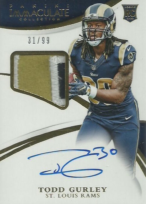 -- Todd Gurley II The Rams' dominating RB wasn't as dominating on Sunday but he didn't need to be as Los Angeles rolled to a 39-10 win over the 49ers. He had 15 carries for 69 yards and two touchdowns and added another via the air. He's just two rushing TDs short of his total from all of last season and he's halfway home on receiving TDs -- and it's not like he was a lightweight last season. His RCs from 2015 and ink from all years will continue to be big deals -- and success in that city for a football team should (but we'll see) spark a lot more demand atop what there is now. Want another sign he's dominant? Per ESPN, he's scored more points himself this season than the Buffalo Bills -- 88 to 81. >> Check out Todd Gurley autos on eBay