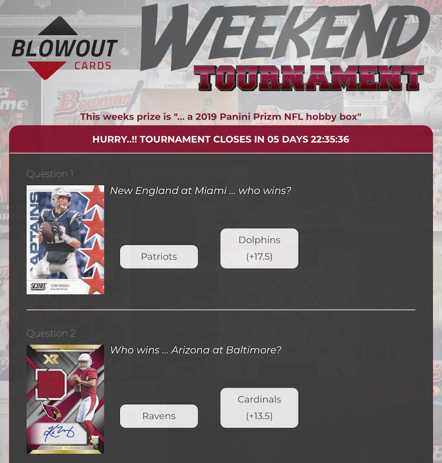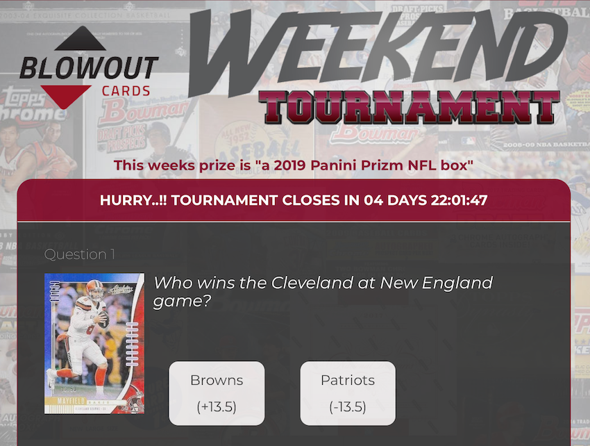 This week's prize is a big one -- a 2019 Panini Prizm NFL box, which can pack some of the biggest football cards of the year. It's worth the minute of your time to click and pick.