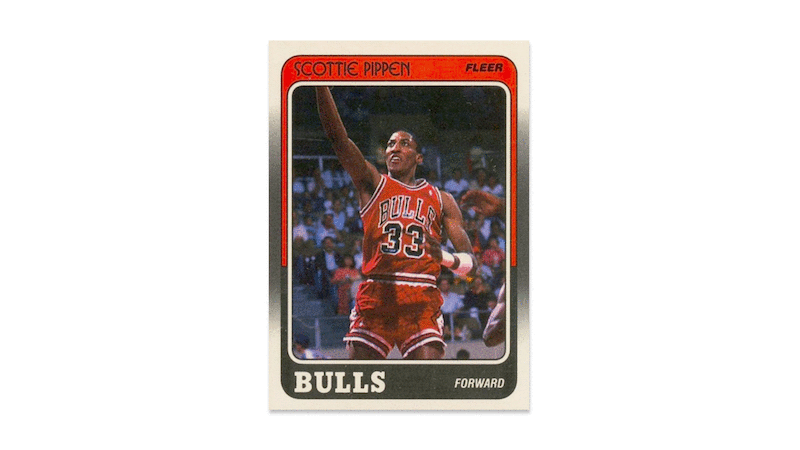 The cards: Scottie Pippen 1988-89 Fleer, Dennis Rodman 1988-89 Fleer, Toni Kukoc 1993-94 Topps Finest, Ron Harper 1987-88 Fleer, Steve Kerr 1989-90 NBA Hoops (series 2), Luc Longley 1991-92 Skybox