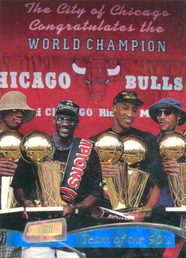 Why they're Buzz-worthy: This one is the P.S. to the Rookie Cards rounded up in the previous section -- you may not want to see Kerr in a Cavs jersey or Rodman in Pistons Blue without his crazy dyed hair if collecting the Bulls. You can focus your collecting habits from cards solely in 1997-98 sets or in the 1998-99 sets that should most-reflect the players from The Last Dance. While Jordan was done playing in 1998-99 he wasn't done appearing on cards -- he had more than 1,800 different releases that year (nearly all from Upper Deck, which continues to make his only cards to this day). The one you see above is a simple 1997-98 Topps Stadium Club base card (No. 5 in the set for the team's fifth title), which dubbed it the Team of the '90s and noted that only three franchises had ever won at least five titles in seven years. Maybe you'll want to grab all Bulls from some sets -- or maybe some players only. This way to collect The Last Dance is a wide-open option and one that, like I said, keeps everybody in the right uniforms.