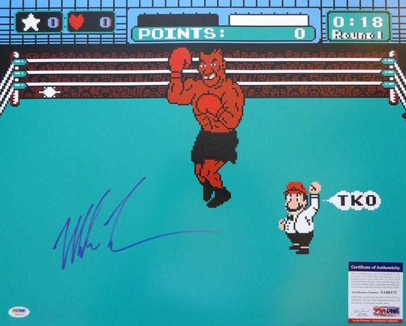Tyson's autos aren't that cheap ($159 for flats up to 11-by-14) at a show, but there are a number of pop culture possibilities here that make for a talker of an autograph. His non-boxing appearances include The Hangover, some very key WWE moments, an Entourage episode, Rocky Balboa and, of course, a best-selling Nintendo game. The key is finding the interesting item from that mix. Tyson will not sign original fight posters or artwork so Buzz is hoping that Mike Tyson's Punch-Out!! screenshots like this one qualify as photos. (If not, you can hunt around and find them already signed for less than his show fee.) You won't get an inscription from Tyson (doesn't sign them) and photo op is $159.