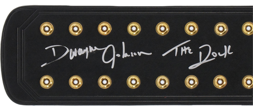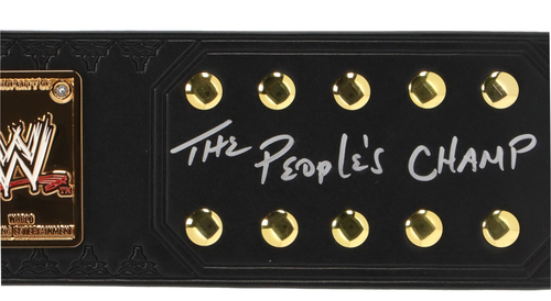 The Rock has signed a WWE Signature Series championship replica and it's on the block via WWE Auctions right now with the net proceeds going from WWE to The V Foundation for Cancer Research, benefiting Connor's Cure. It's signed with his name as well as his ring name on one side and it also has an inscription of "The People's Champ" on the opposite strap.