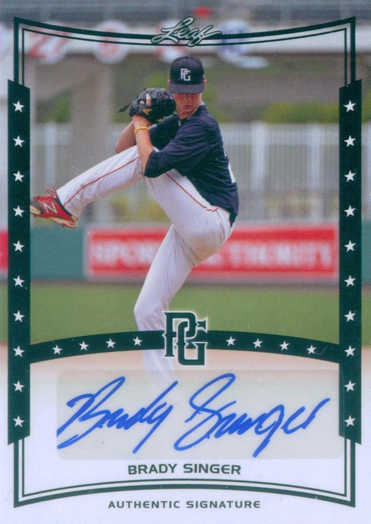 Another potential No. 1 guy is Florida Gators pitcher Brady Singer, who is 11-1 with a 2.27 ERA and 98 strikeouts and 19 walks in 95 innings this season. He's got little more than a dozen baseball cards but 10 certified autographs and they're all found in the 2014 Leaf Perfect Game Showcase set. (It's also possible some of those boxes will make it into the forthcoming Showcase Vault product.)