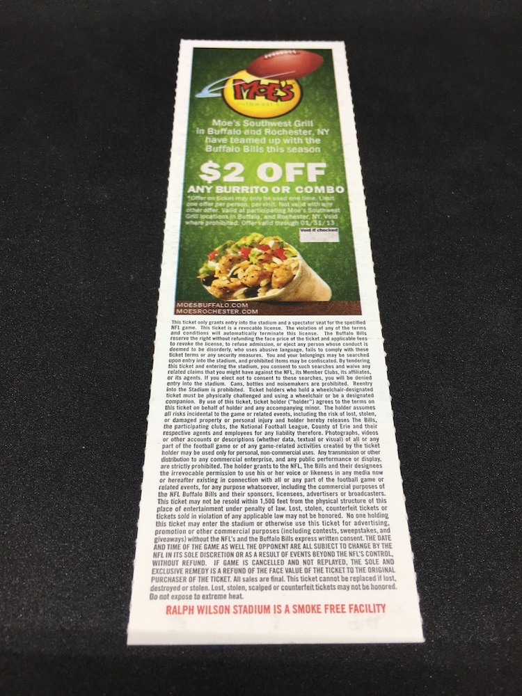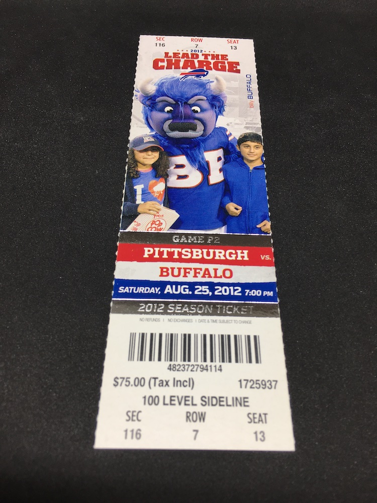 What's Buzz-worthy: This one was a spanking with Brown leading the way but, well, he's a collecting non-factor now and this ticket really isn't a good one for a Steelers rout ... unless Billy Buffalo (the mascot) is signing autos or the kid on the right has NFL potential now. (You don't know! Maybe! #sarcasm.) Roethlisberger had 169 passing yards and Leftwich had 105 (and two TDs) while the other side had two other notables throwing but the only score was a rushing TD from Fred Jackson. There are quite a few "names" in the box score but nobody who matters today if you ask me as a collector. What I found interesting and not in a good way here is how this ticket was $75 ... though I guess that view isn't bad for an NFL game (see gallery).