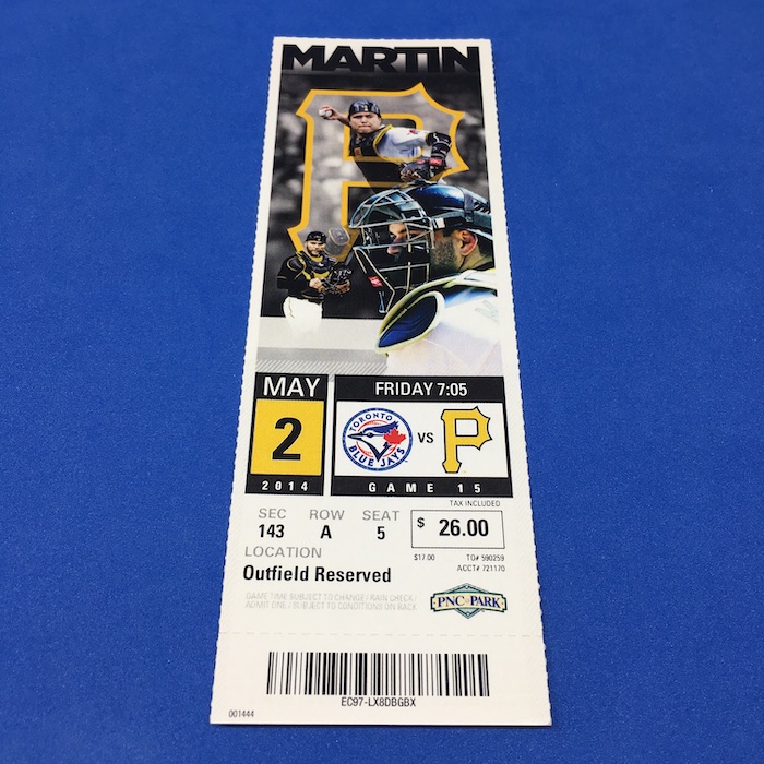 What's Buzz-worthy: The story for this one was the Pirates winning the game off a pair of ninth-inning homers and there are a lot of reliable names in the box score here ... but this one isn't even as flashy as the ticket itself. To be honest, I pulled this one out of the ol' mystery box as I thought the design looked good for a still-busy Photoshop montage, but ... it turns out that Russell Martin didn't play in the game. Sums up this one. McCutchen's 846th-848th career hits happened here while it was career homer No. 93 for Alvarez and No. 19 for Marte ... not sure I'd bother with anything here more than a Martin auto, though.