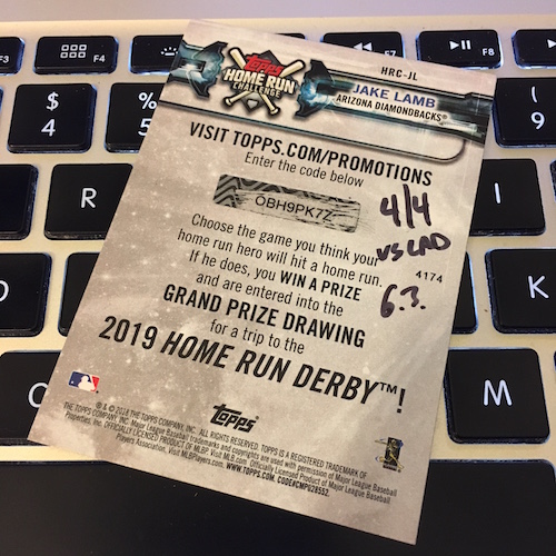 I read the instructions, scratched the code and hit the link on the card -- but only after I scouted Lamb's splits for last season and noticed that he had the most home runs against the Los Angeles Dodgers and most of his homers were at home. Then I checked the season schedule and, what do you know, his Arizona Diamondbacks host the Dodgers to open April. I picked Game 3 of their series on April 4, figuring deeper into the rotation might be better odds for a home run. (In other words, aiming to avoid Clayton Kershaw.)