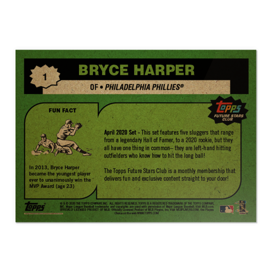 Harper, dubbed the Future Stars Club Brand Ambassador, is one of five players in the "Left-handed Power-hitting Outfielders" set that you can see below.