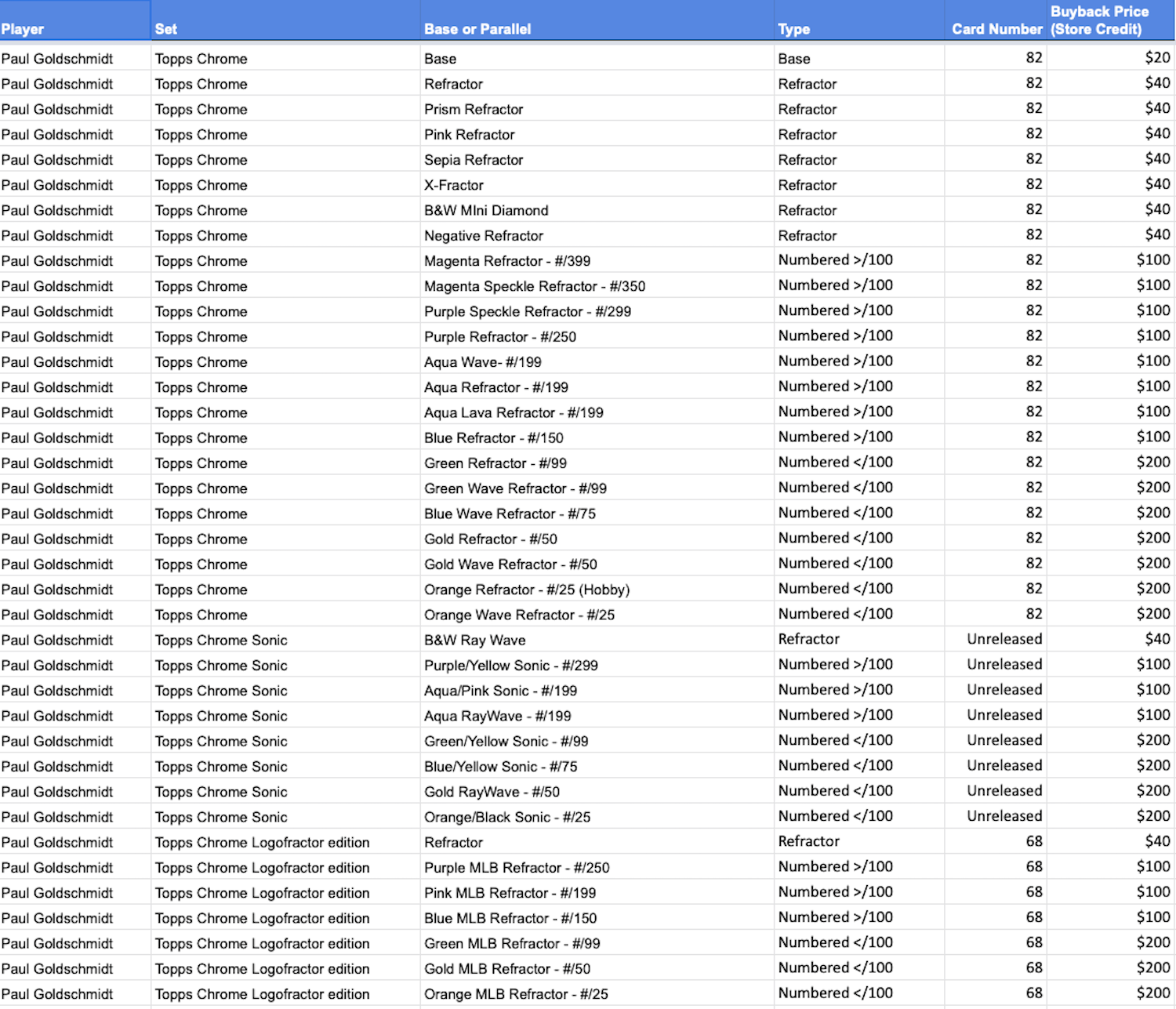 For both Judge and Goldschmidt, all cards numbered /399, /350, /299, /250, /199, or /150, the buyback amount is $100. For all cards numbered /99, /75, /50, or /25, the buyback offer is $200. Topps encourages collectors to use the #ToppsMVPBuyback hashtag on their social channels to show off their wins or let their friends find out more about the program.