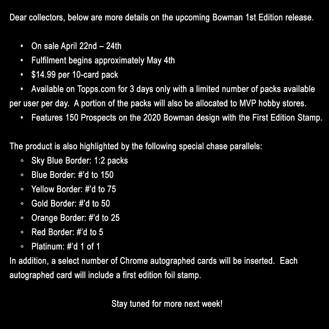 Update: The packs will go on sale from April 22-24 with them shipping early May -- $14.99 per 10-card pack -- with an limited amount for each day for each buyer on Topps.com. They will include 150 prospects with a First Edition stamp and there will be seven parallels per card -- Sky Blue (every other pack), Blue (/150), Yellow (/75), Gold (/50), Orange (/25), Red (/5) and 1/1 Platinum. There also will be a limited number of Chrome autograph cards also in the mix with a First Edition stamp on every card. There also will be a limited number of packs allocated to Topps MVP hobby shops.
