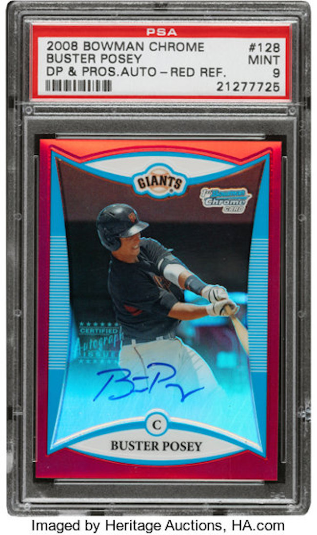 - 2008 Bowman Chrome Draft Picks & Prospects Autographs Buster Posey (Red Refractor) #BDPP128 PSA 9 1/5 — sold for $9,300.