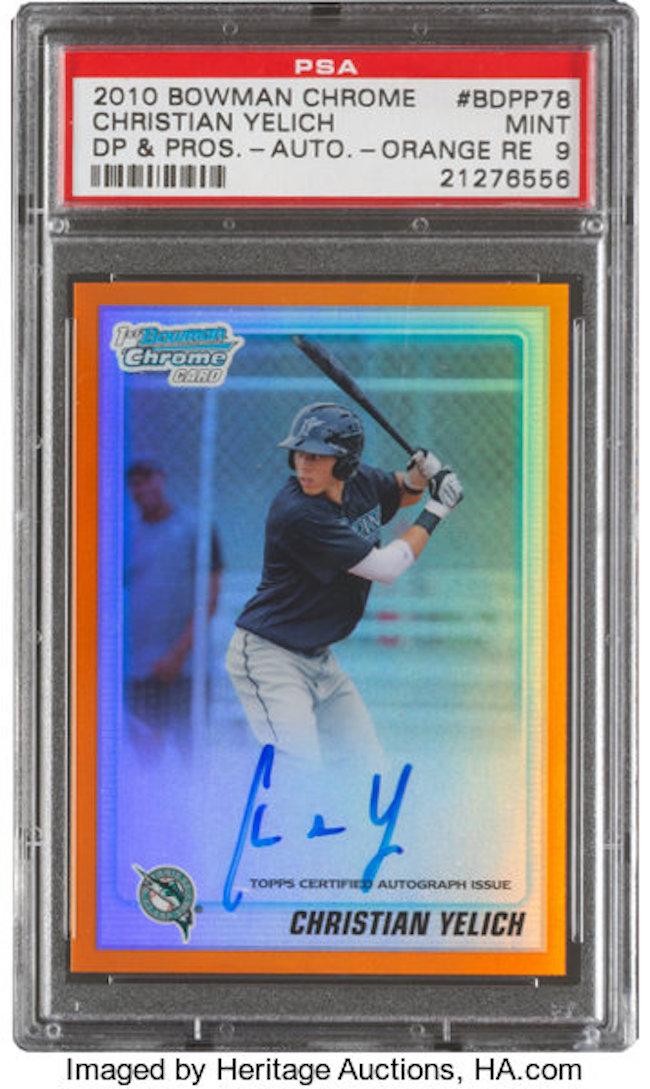 - 2010 Bowman Chrome Draft Prospect Autograph Orange Refractor Christian Yelich 5/25 #BDPP78, PSA 9 — sold for $8,700.