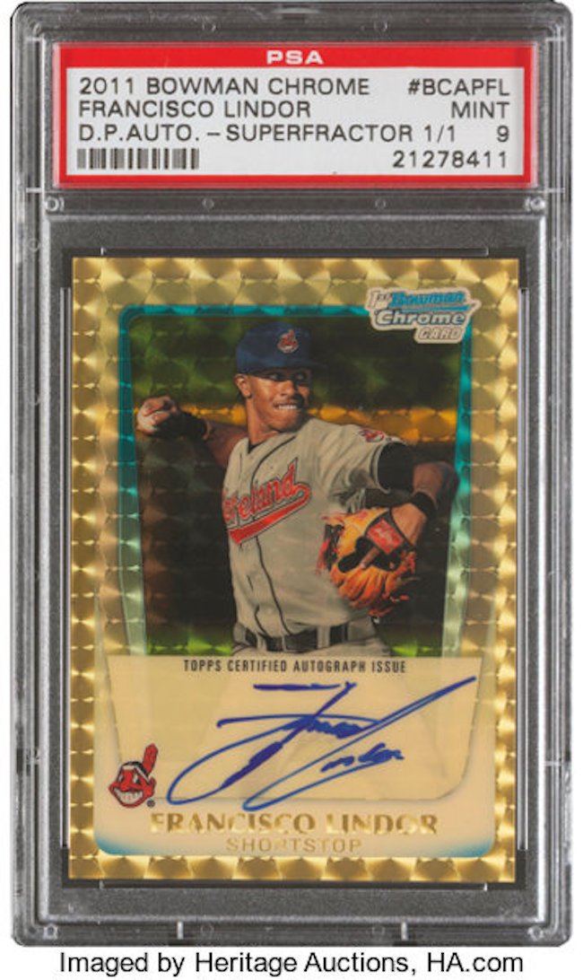 - 2011 Bowman Chrome Draft Prospect Autograph Superfractor Francisco Lindor 1-1 #BCAP FL, PSA 9 — sold for $102,000.