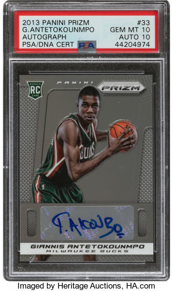 - 2013-14 Panini Prizm Giannis Antetokounmpo #33 PSA 10, Auto 10 — sold for $4,920.