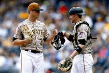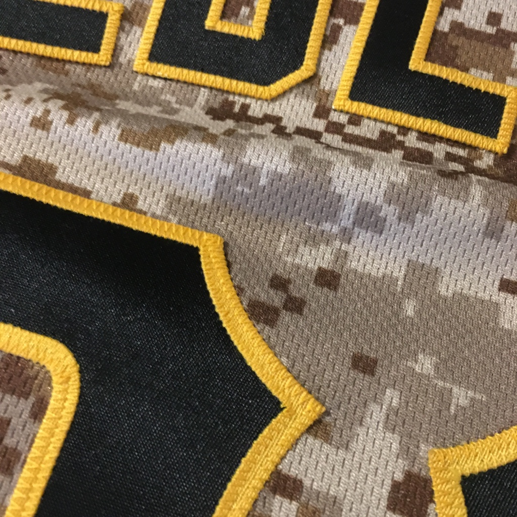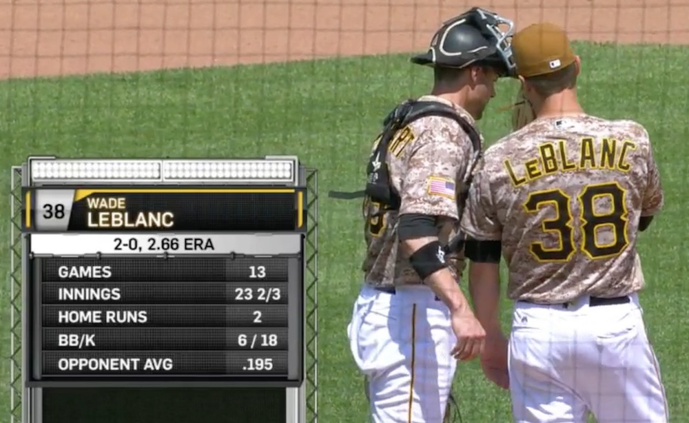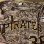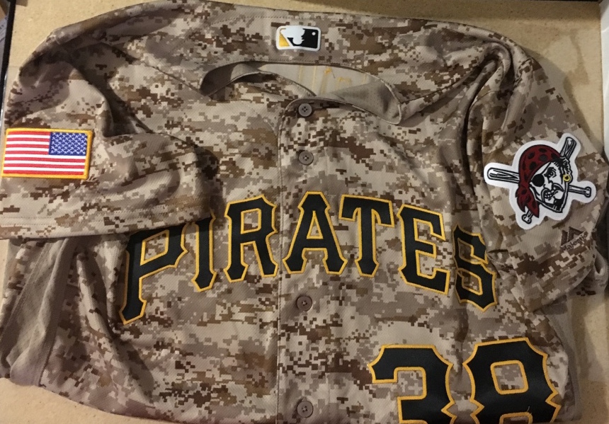 I had to start over, not being able to find images of LeBlanc in action in the other jerseys via Getty but I did manage to find two lower-resolution images of him in his camo jersey and one in the Fourth of July jersey both from The Associated Press. So then I went back and forth comparing the remaining jerseys and opted for the camo because it simply looked better than the other leading candidate that just didn't feel like a Pirates jersey to me with its Fourth of July colors. Done deal.