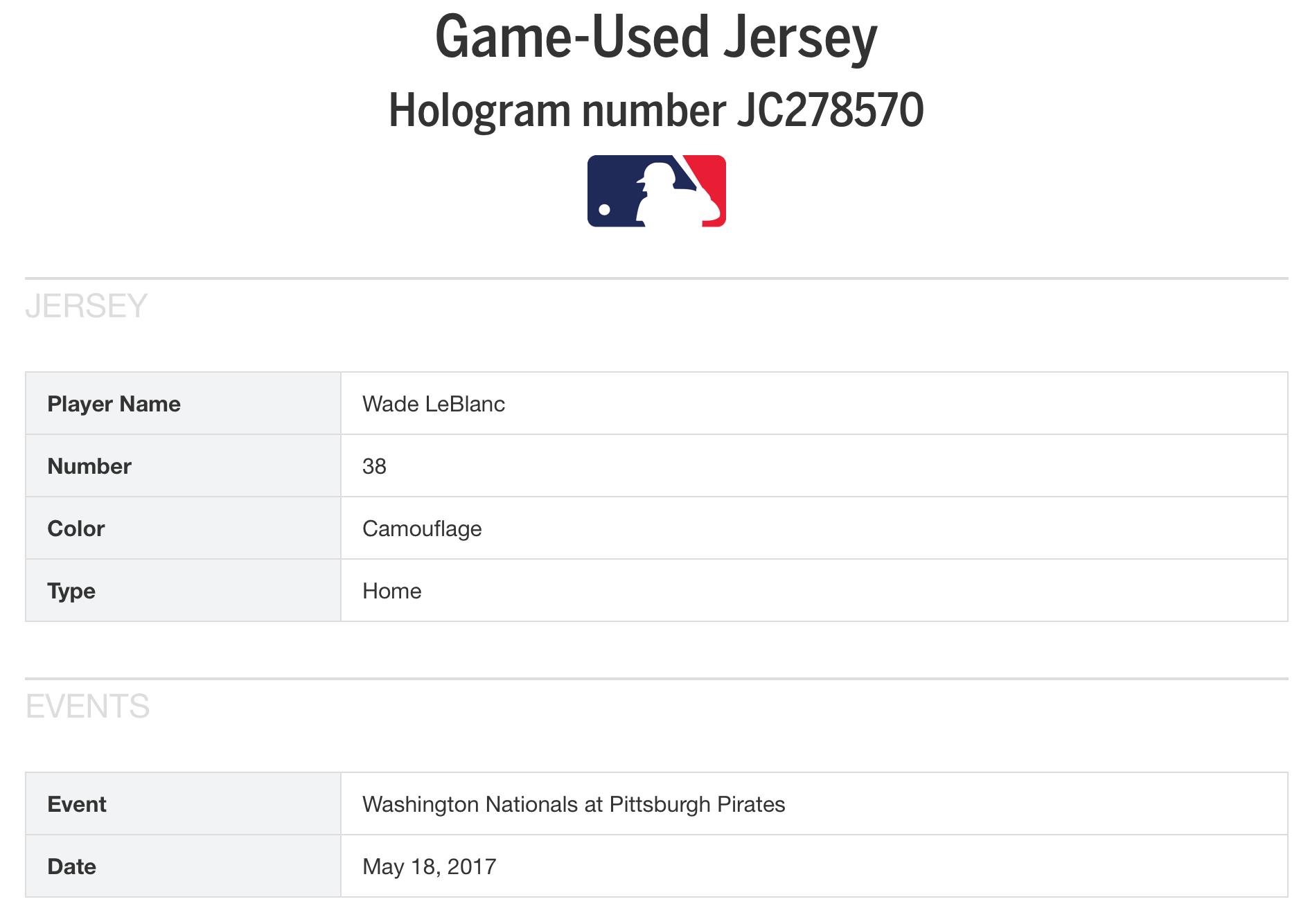 One of the dealers of baseball stuff that I check out from time to time recently had a run of LeBlanc game-used Pittsburgh Pirates jerseys available -- on sale even -- that ran the gamut of possibilities for MLB Authenticated pieces. Standard LeBlanc jerseys, a Jackie Robinson Day No. 42 jersey, a Fourth of July jersey, a military jersey worn for Thursday games (Memorial Day gets a different jersey for the Pirates), a batting-practice jersey and even a uniform-and-pants combo when the Pirates honored the Homestead Grays were all up for grabs.