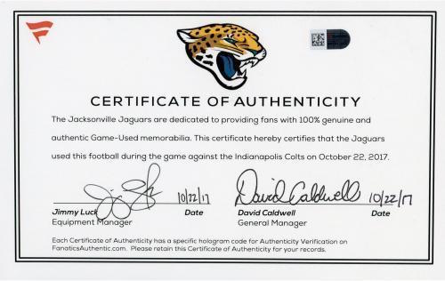 While the ball I bought above was simply sold by Fanatics as a general game-used ball from the Jaguars' game against the Colts on Oct. 22 in Indianapolis -- one of only two from the game that I saw offered by the company as they go fast -- thanks to some unique markings on the ball, I can pinpoint an exact play where it was used.