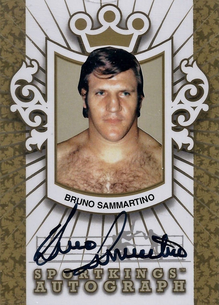 He appears on nearly 250 different wrestling cards but fewer than 90 of those are certified autographs. His earliest signed cards can be found in the 2010 SportKings release, while Leaf Trading Cards landed him for its 2012 Leaf Originals and other 2013 releases. That also was the year when he had his first WWE autos in 2013 Topps Best of WWE. He also appears in 2015 Topps Chrome WWE and the landmark 2015 Topps WWE Undisputed set. His final autographs can be found in boxes of 2017 Topps Heritage WWE and Legends of WWE where he has dual autographs (just 26 copies in all) with former student turned foe Larry Zbyszko. They headlined a steel cage match main event held at Shea Stadium in 1980. On the undercard? A match between Andre The Giant and a young star named Hulk Hogan, who would help change wrestling with a match seven years later at WrestleMania III.